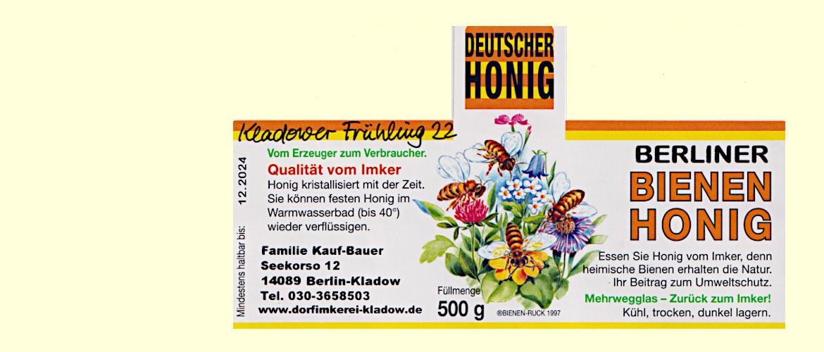 Die Dorfimkerei Kladow ist die Honig Imkerei Berlin Kladow vom Berlin Imker Thomas Kauf in Berlin-Spandau. In der Honig Imkerei Berlin Kladow (Berlin-Spandau)werden hauptsächlich 3 Sorten Honig produziert: Honig Kladower Frühling, Honig Kladower Robinie und Honig Kladower Linde. Dazu stehen für den Berlin Honig Imker Bienen an verschiedenen Standorten in Berlin Kladow (Berlin-Spandau) und sammeln in Berlin Kladow (Berlin-Spandau) Nektar von Ahorn, Kastanie, Robinie, Linde, Löwenzahn und Wiesenblumen und machen daraus den Berlin Honig Kladow der Dorfimkerei Kladow (Berlin-Spandau).